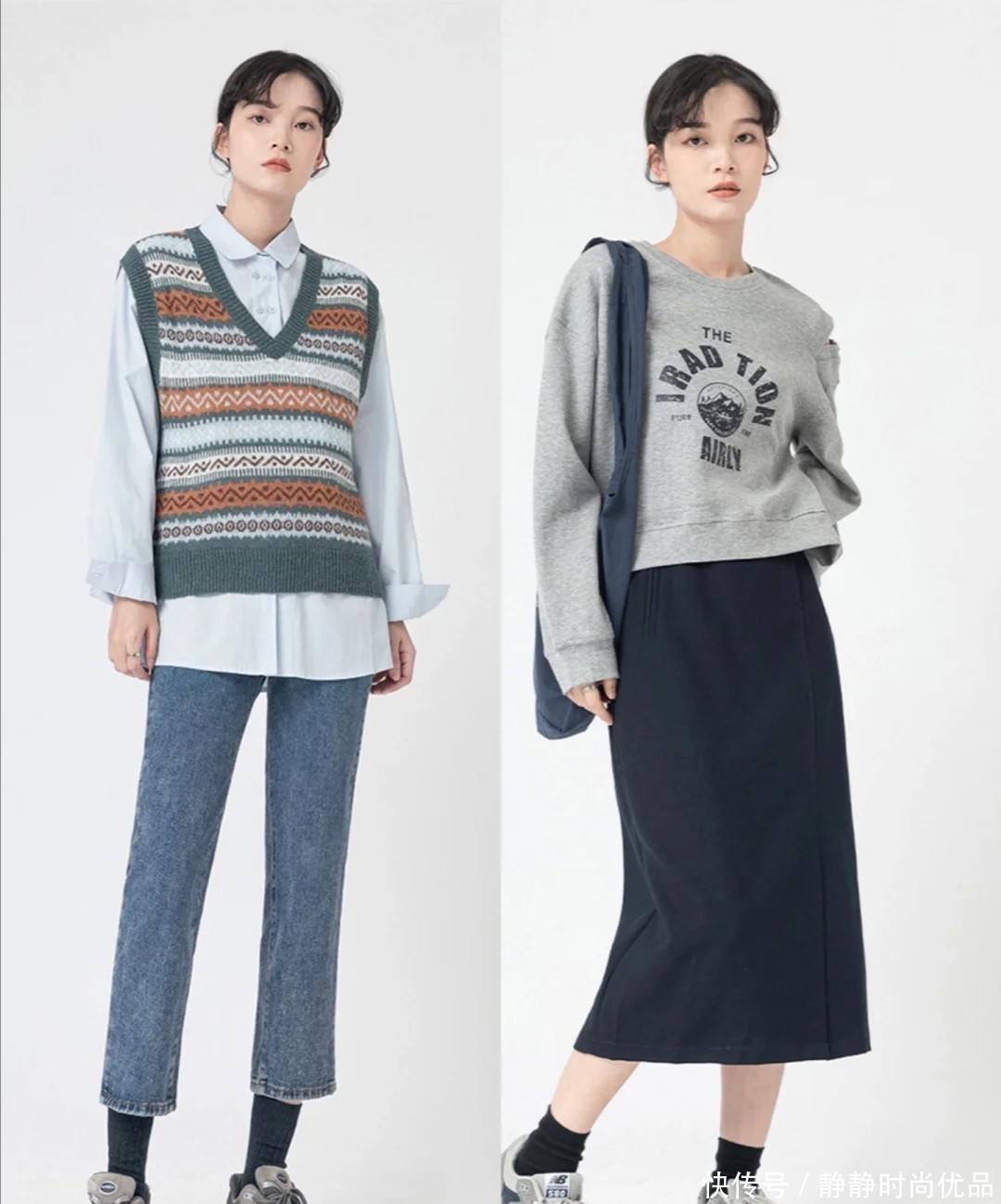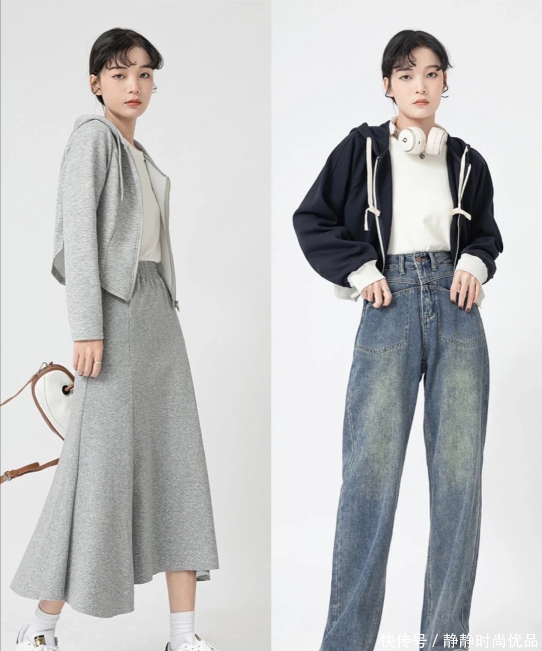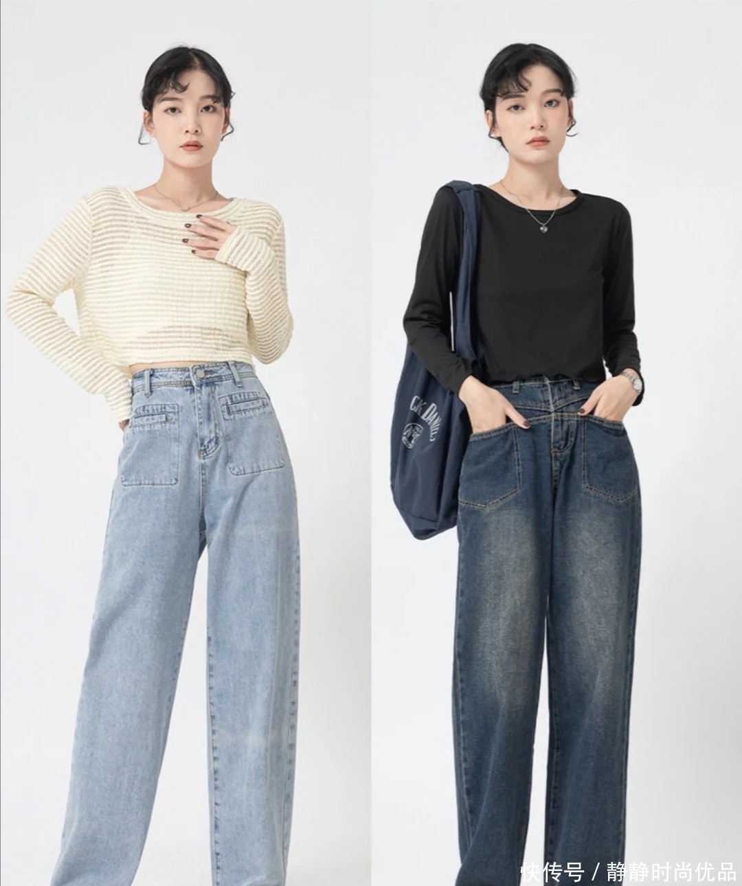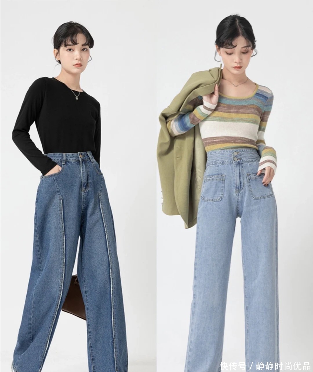 这两条蓝色牛仔裤,都是不会过时的单品,也可以用来调整身材。利用短一些的上衣和它配合,就能延长下半部分的线条。
