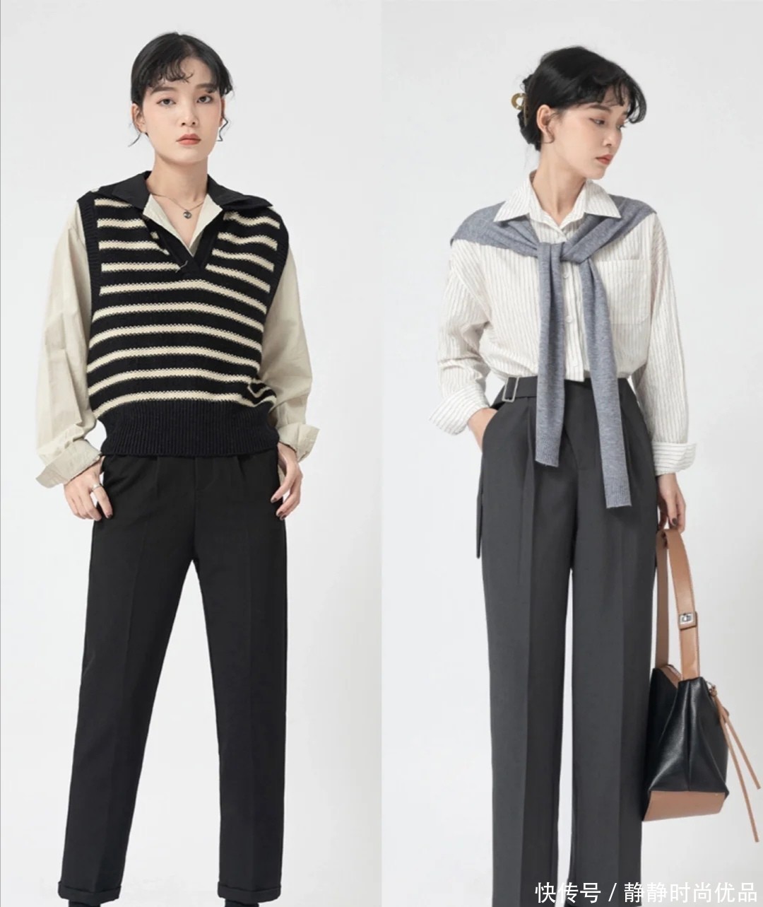 黑白条纹针织马甲,因为颜色的选用确实具备适度的包容性,在里面可以叠加各种品类丰富的单品,以衬衫为主,不如选用颜色寡淡的衬衫单品,突破它的单一感。
